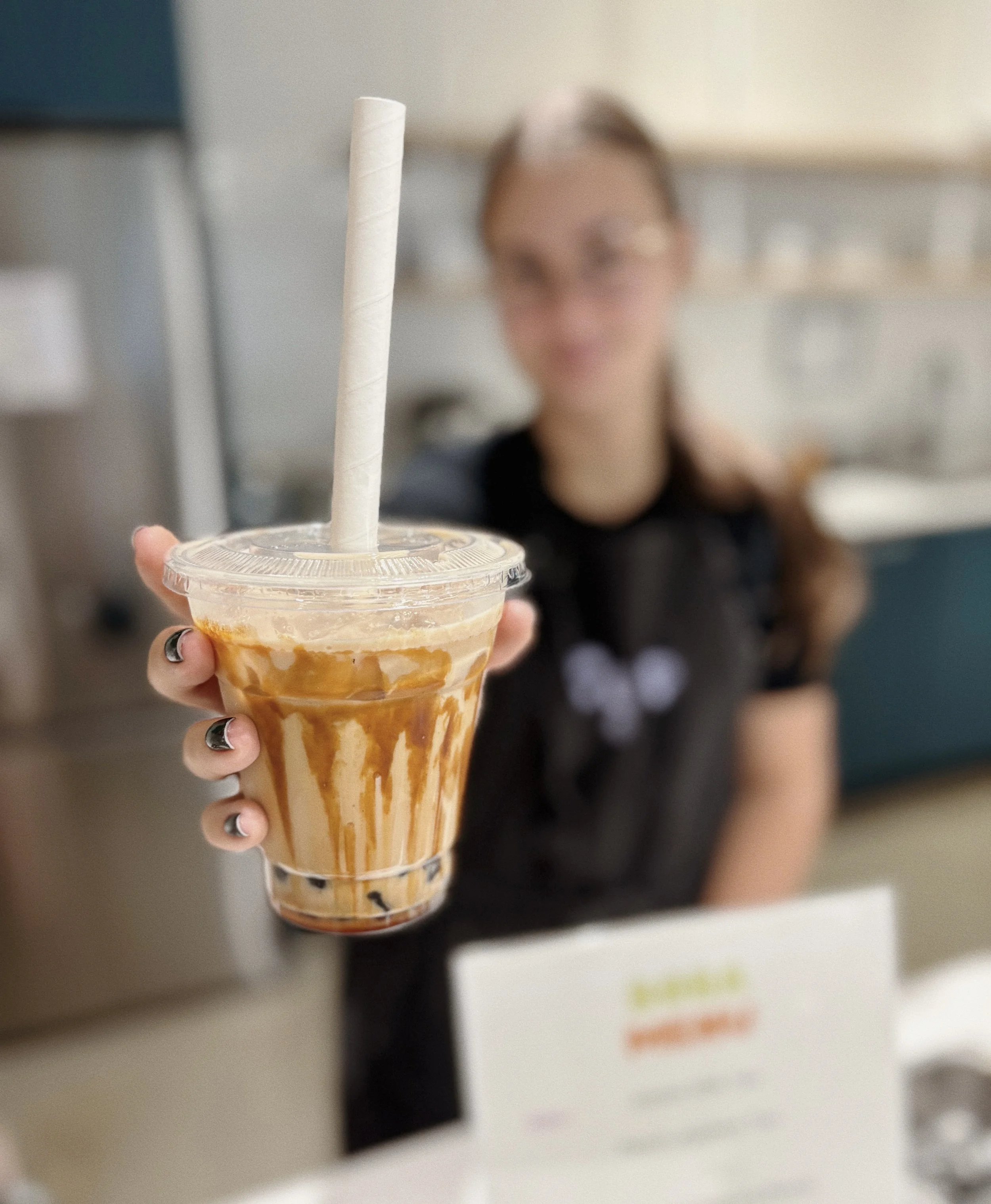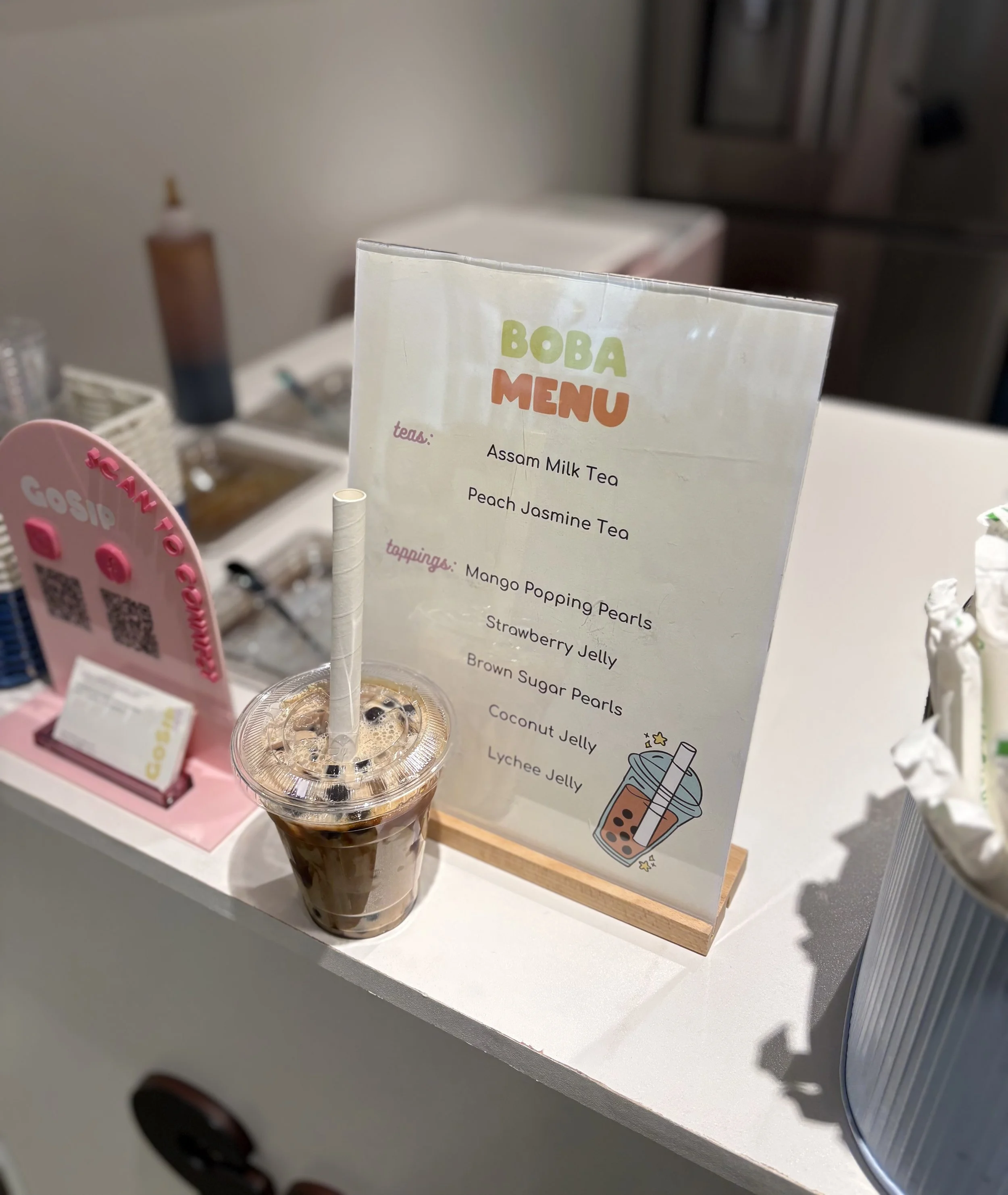 ✓ A curated bubble tea menu with 2 signature teas and 4 toppings total (brown sugar pearls + 3 of your choice)